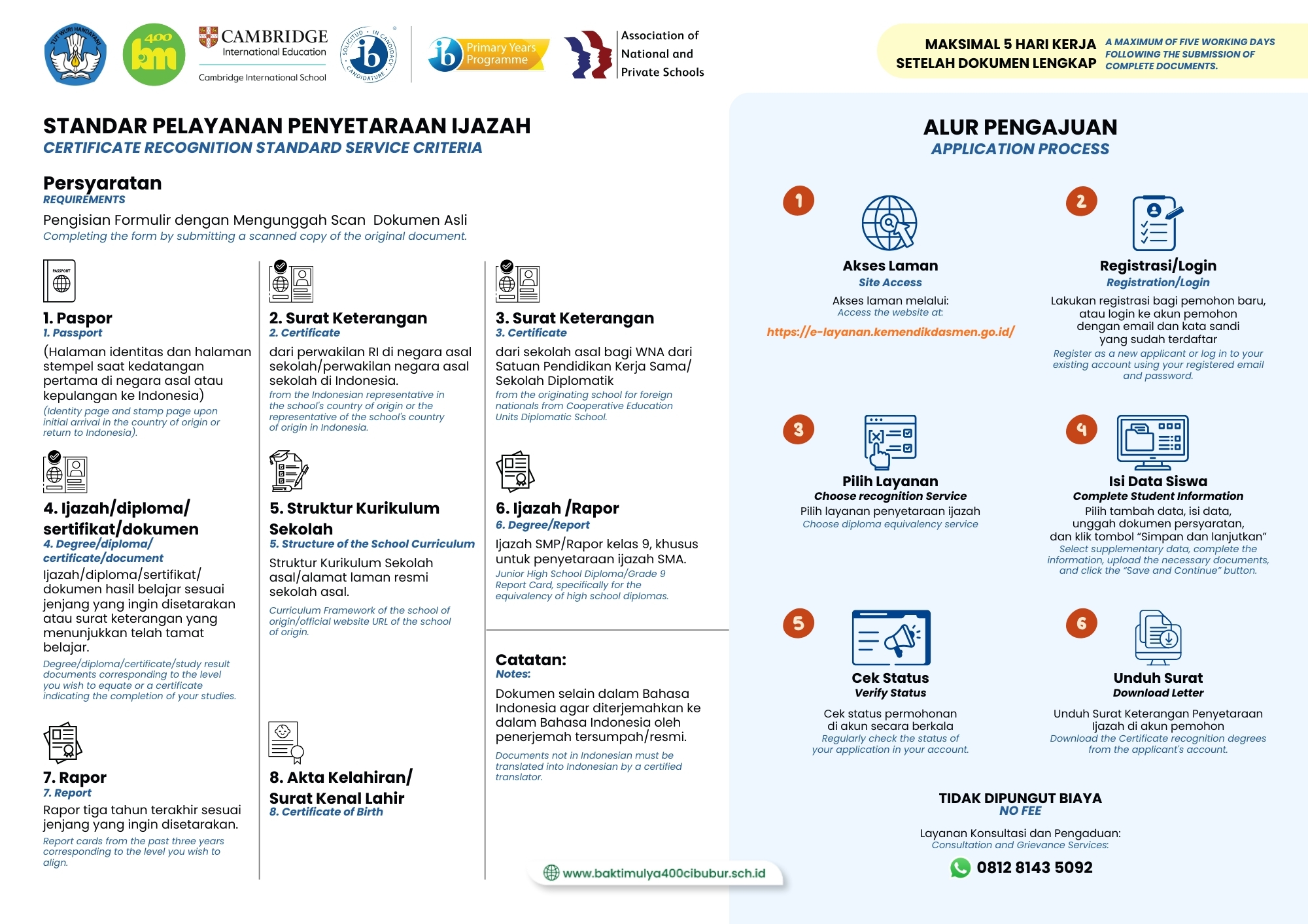 Due to the increasing number of applicants from overseas, we would like to inform our school community about the procedures and standard service criteria for certificate recognition, in accordance with the regulations set by the Ministry of Primary and Secondary Education of the Republic of Indonesia (Kemendikdasmen @kemendikdasmen ).